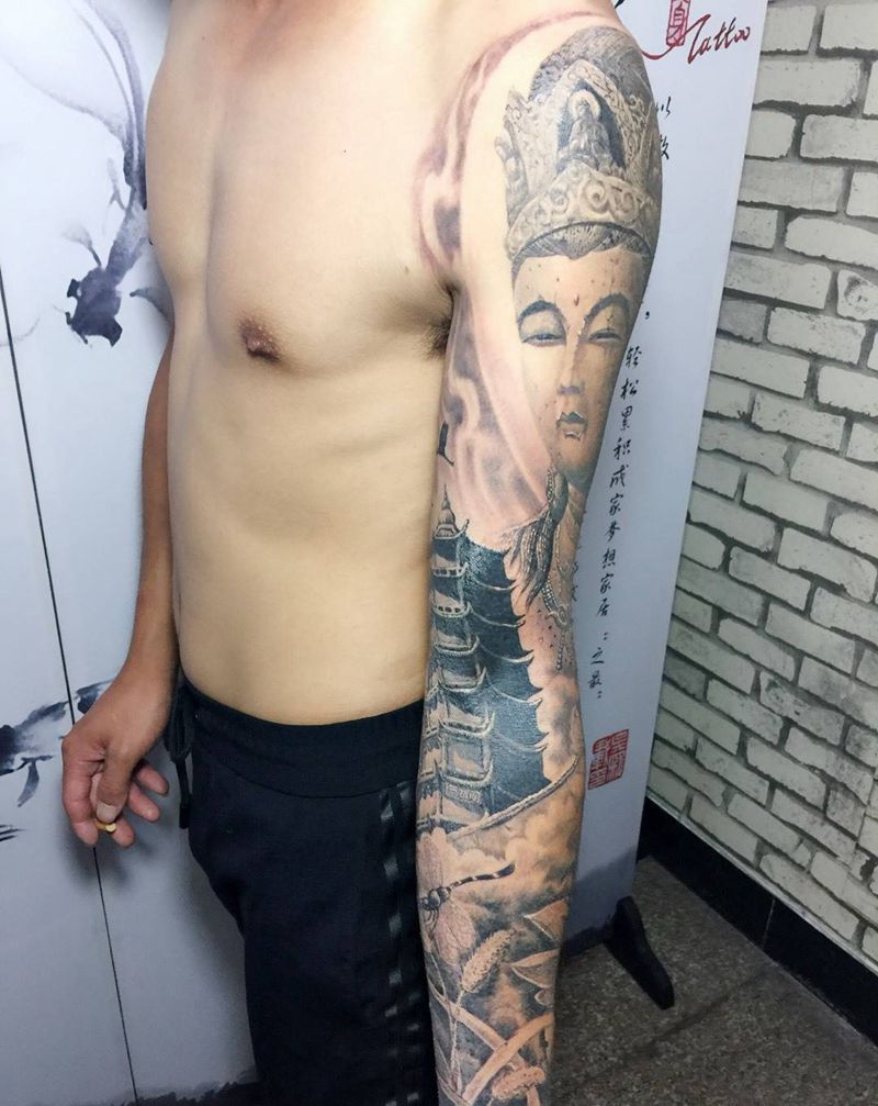 当前位置: 首页 >浙江省金华市纹身店-行者纹身纹身图案>中国风花臂纹身图片_成品手臂传统写实人物鬼神宗教纹身图案