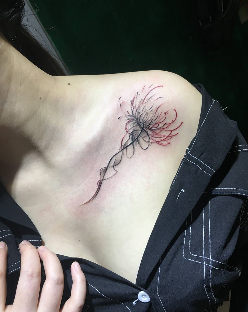 当前位置: 首页 >浙江省台州市纹身店-手艺人纹身工作室纹身图案>彼岸花纹身图片_胸部水墨纹身图案