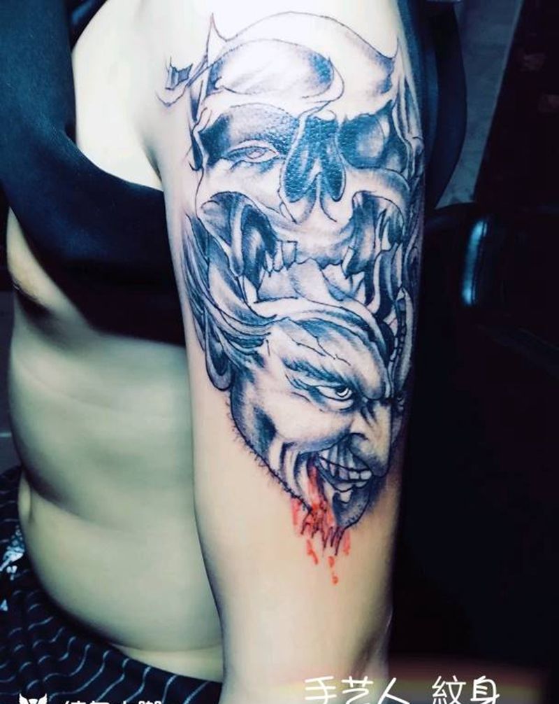 当前位置: 首页 >浙江省台州市纹身店-手艺人纹身工作室纹身图案>魔头纹身图片_手臂传统鬼神纹身图案