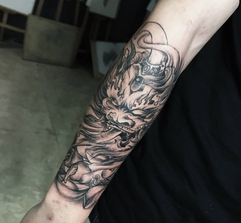 当前位置: 首页 >浙江省衢州市纹身店-龙炎纹身纹身图案>小臂狮纹身图片_手臂纹身图案