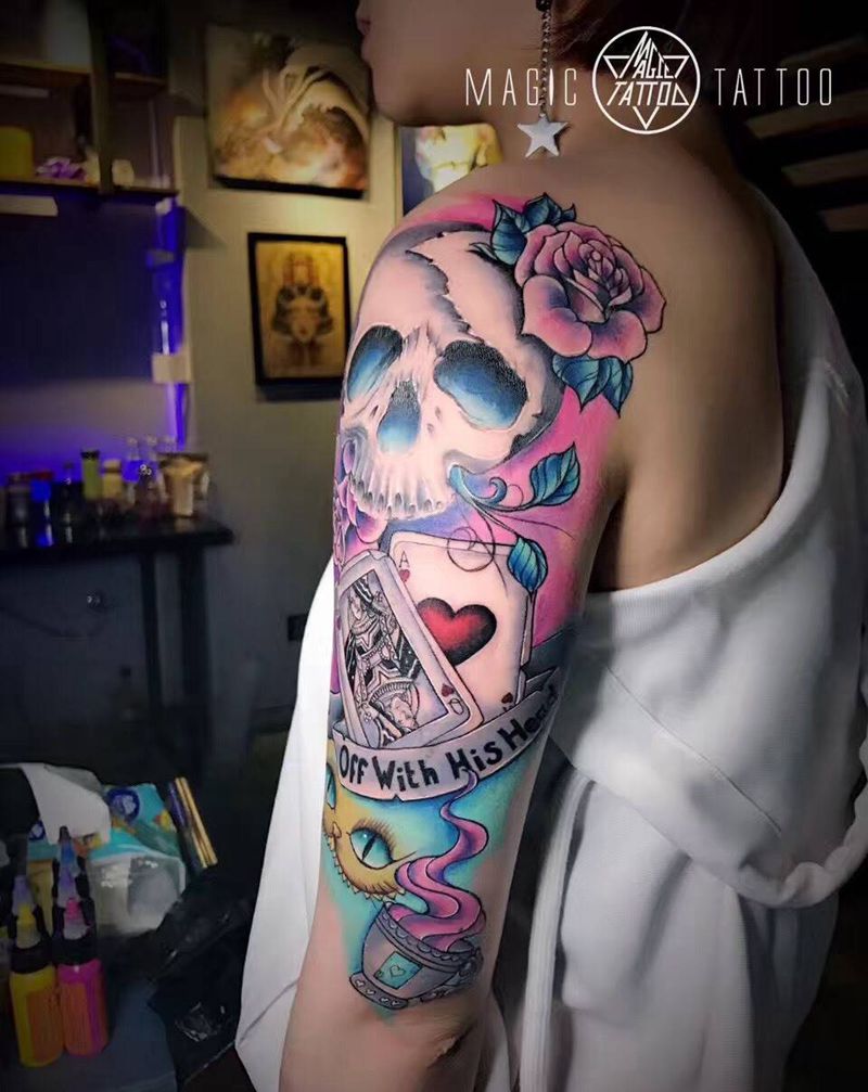 骷髅版爱丽丝梦游仙境纹身图片_手臂欧美蚌埠彩色骷髅遮盖猫爱丽丝扑克茶杯纹身图案