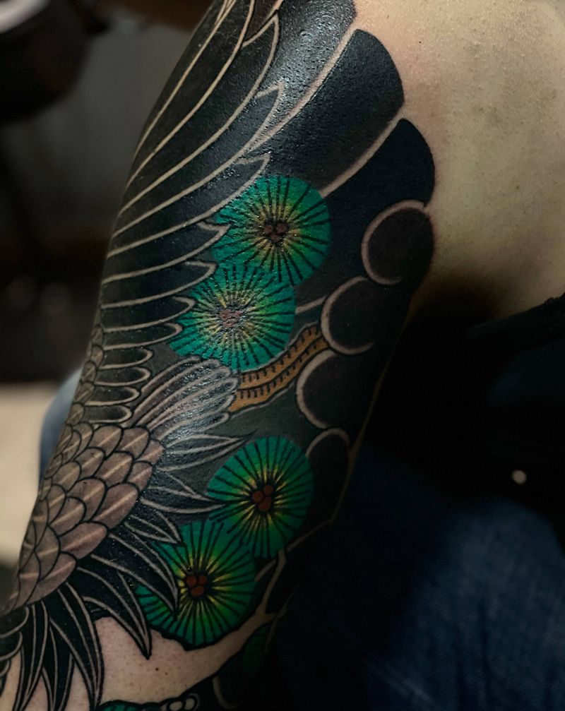 当前位置: 首页 >安徽省合肥市纹身店-彫木兮刺青处纹身图案>鹤松纹身图片_手臂老传统纹身图案