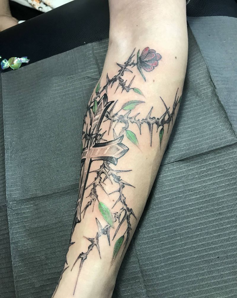 当前位置: 首页 >安徽省芜湖市纹身店-芜湖龍刺青纹身图案>荆棘十字架纹身图片_手臂点刺纹身图案