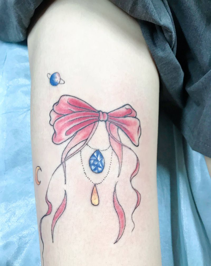 蝴蝶结纹身图片_腿部水彩纹身图案