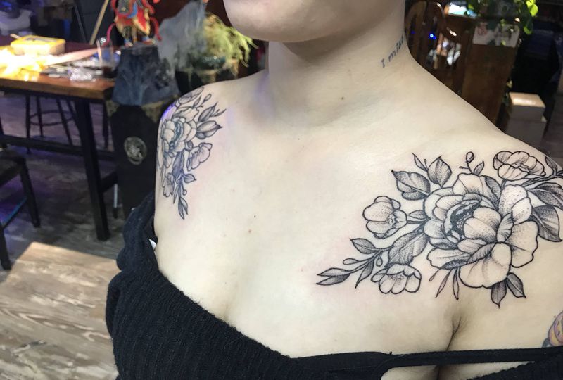 素花纹身图片_肩部点刺纹身图案