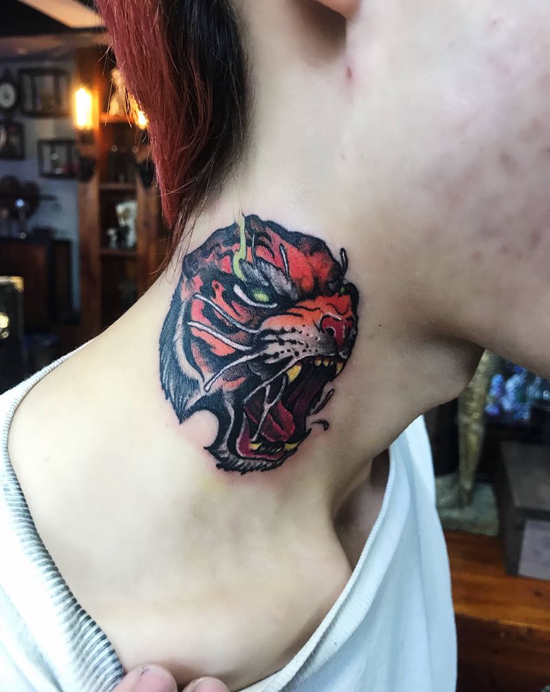 老虎纹身图片_颈部New School纹身图案