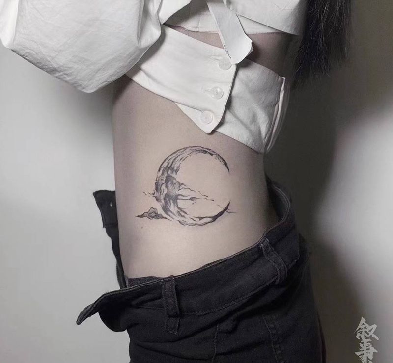 水墨月亮遮盖纹身图片_腰部水墨月亮纹身图案