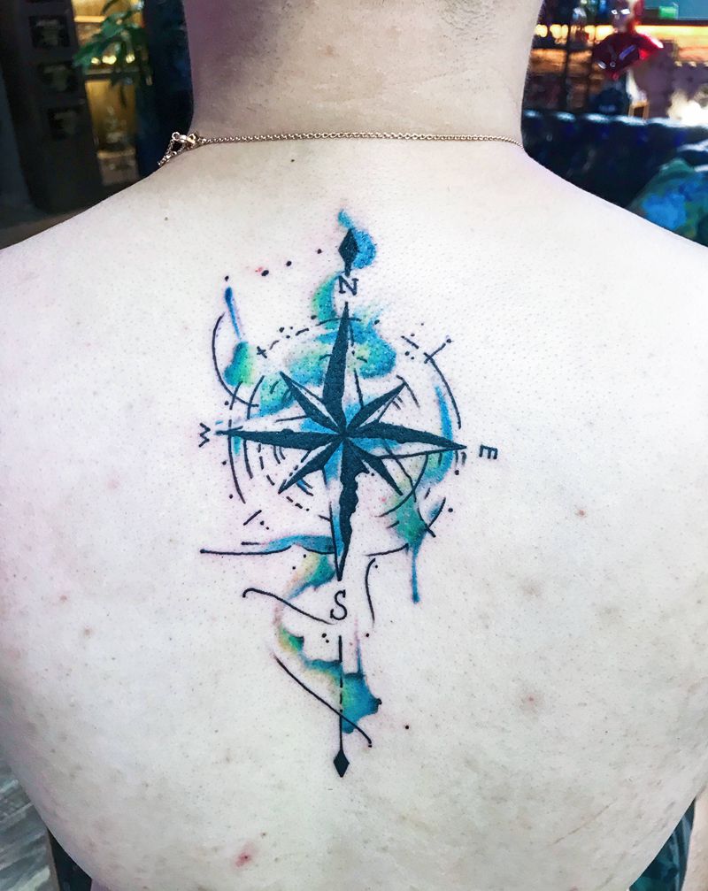 指北针纹身图片_背部水彩纹身图案