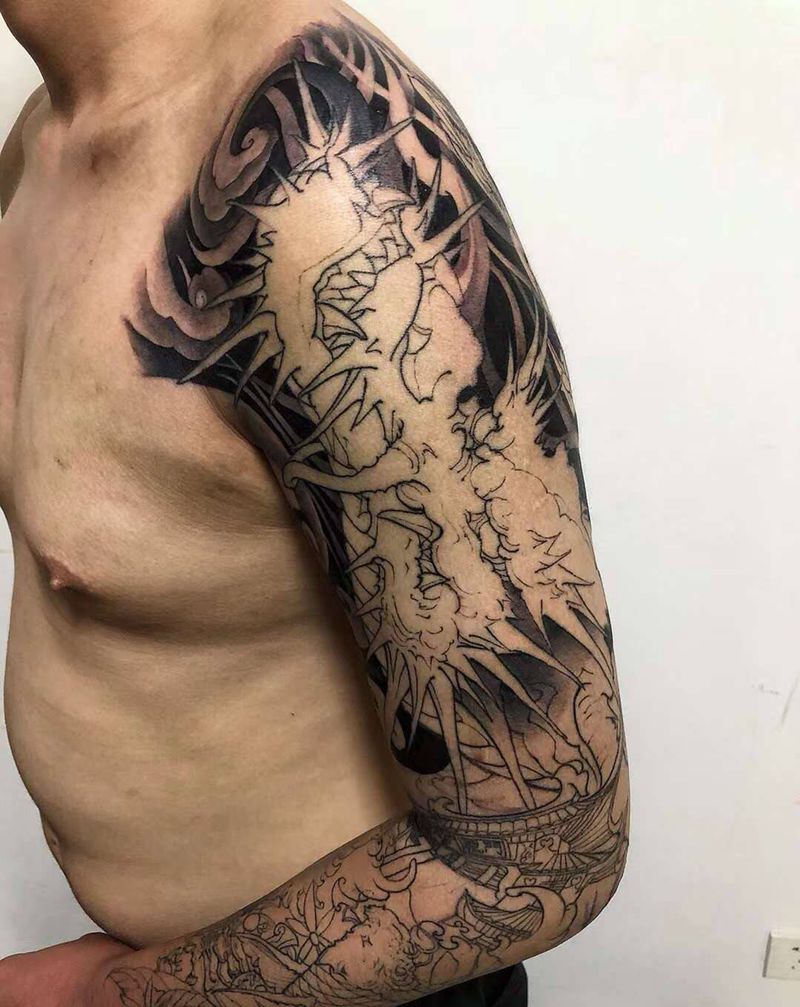当前位置: 首页 >安徽省安庆市纹身店-辰针刺青处纹身图案>花臂龙纹身图片_手臂新传统龙纹身图案
