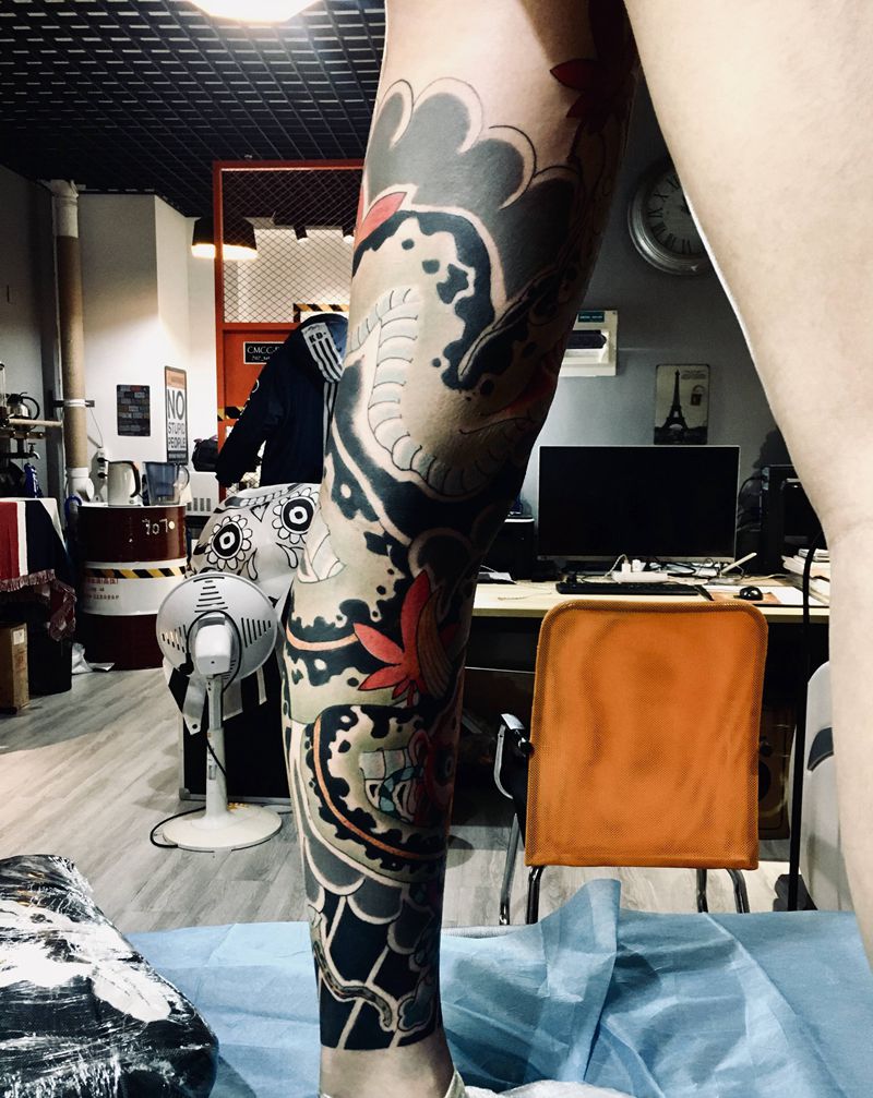 • T网红王老大花腿龙纹身图片_腿部新传统纹身图案