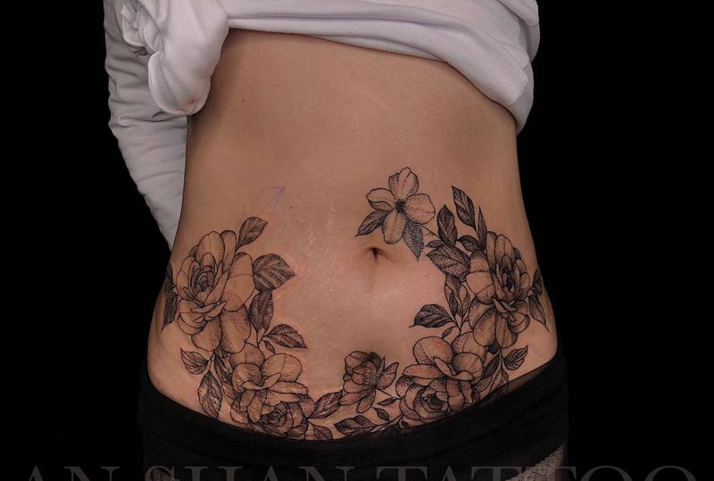 素花/妊娠纹遮盖纹身图片_腰部点刺花纹身图案