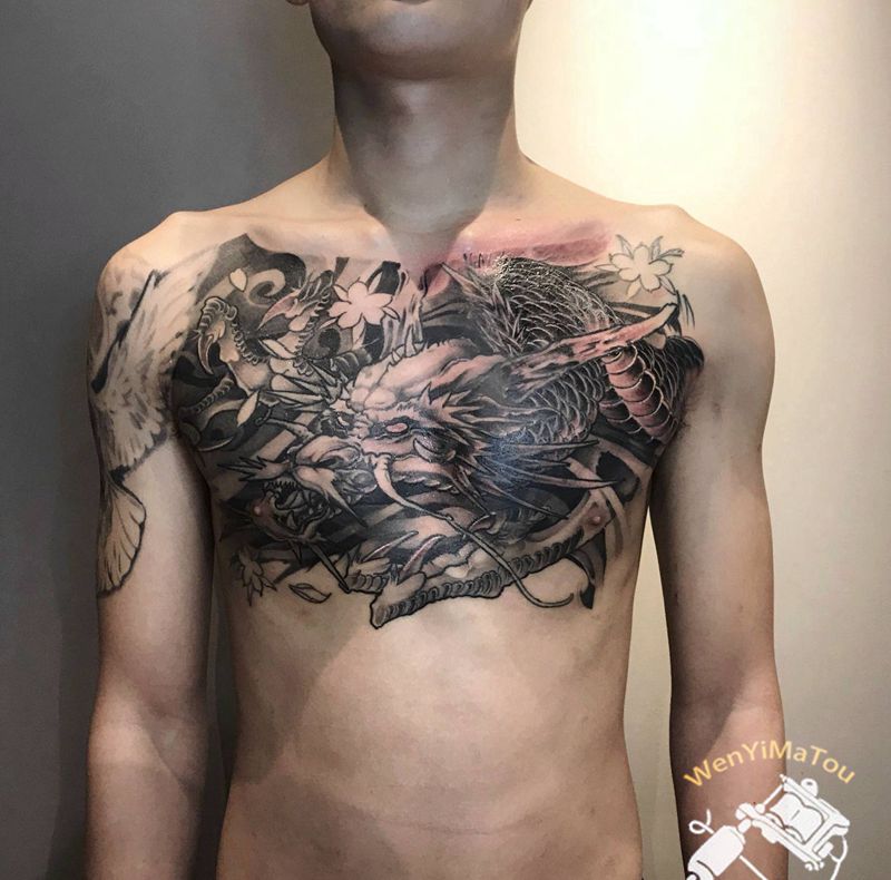 花胸龙遮盖前后纹身图片_胸部纹身图案