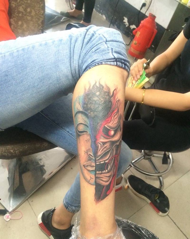 • T包小腿吹火男+阿多福纹身图片_腿部老传统新传统吹火男阿