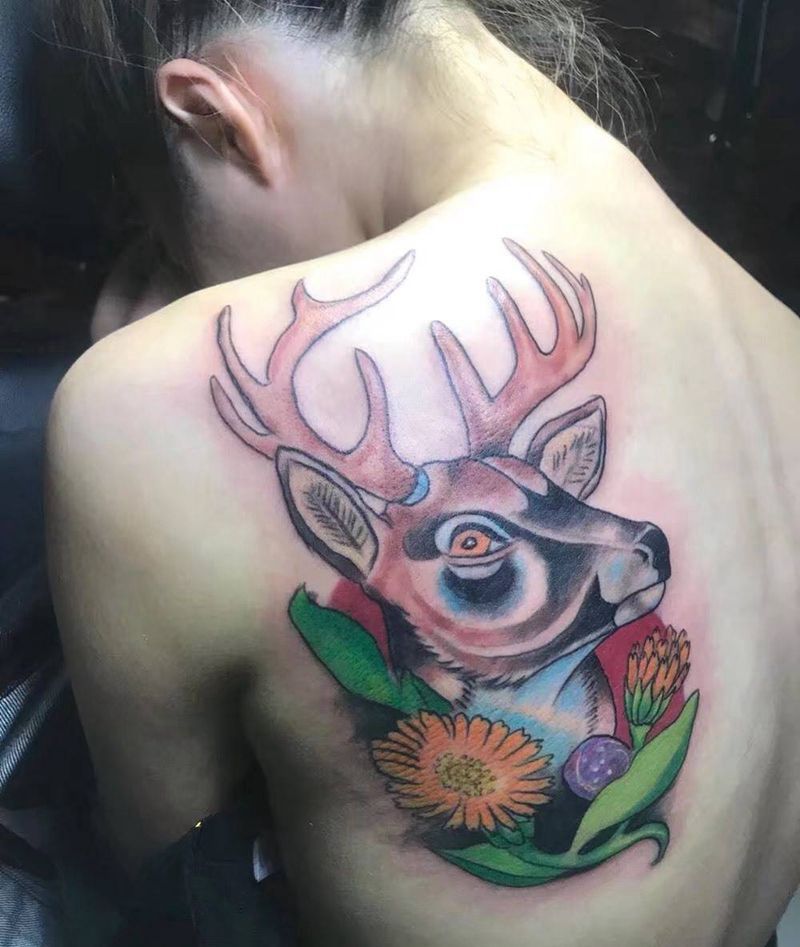 麋鹿纹身图片_肩部背部New School鹿纹身图案