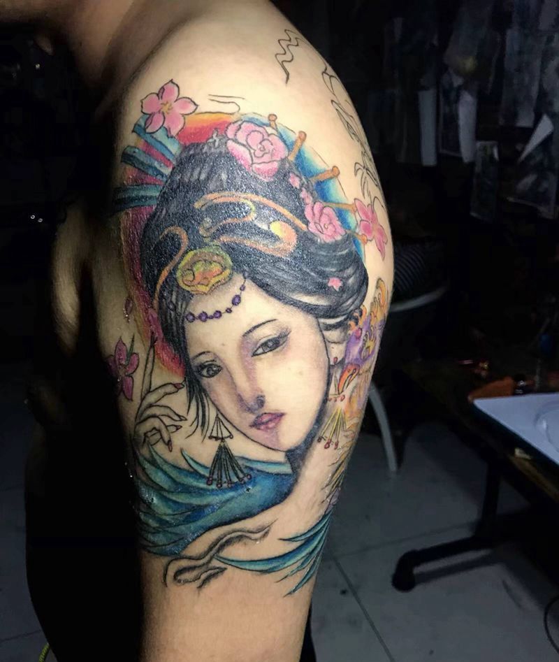 当前位置: 首页 >安徽省宿州市纹身店-The 7s Tattoo纹身图案>艺妓 遮盖纹身图片_手臂肩部新传统艺妓 遮盖纹身图案
