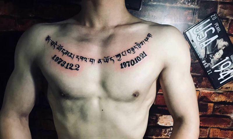 藏文纹身图片_胸部颈部花体字藏文原创纹身图案