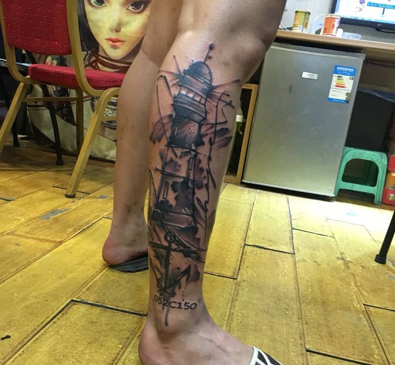 • T包小腿吹火男+阿多福纹身图片_腿部老传统新传统吹火男阿