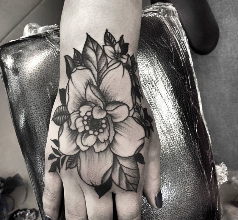 • 手背潮流时尚的玫瑰花眼睛纹身图案