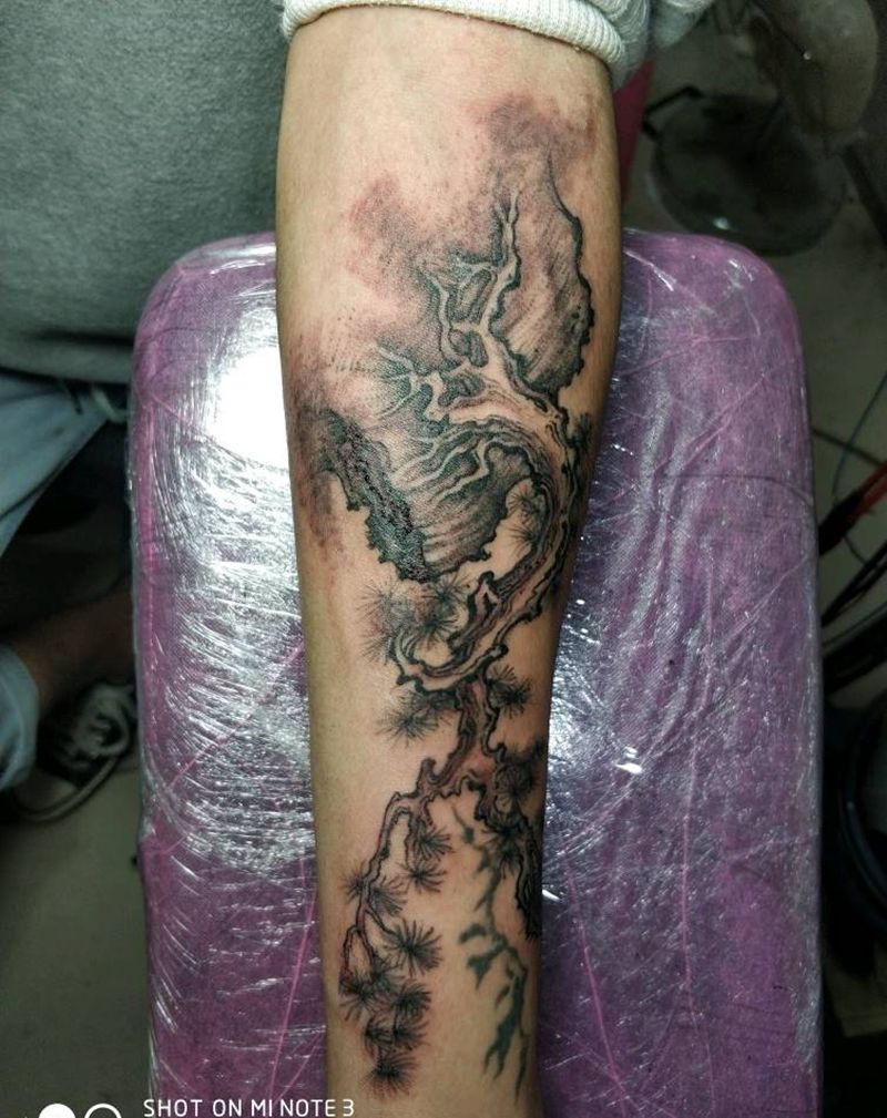 鹤长松颠,独宿万岩雨。龙湫在纹身图片_手臂水墨新传统纹身图案