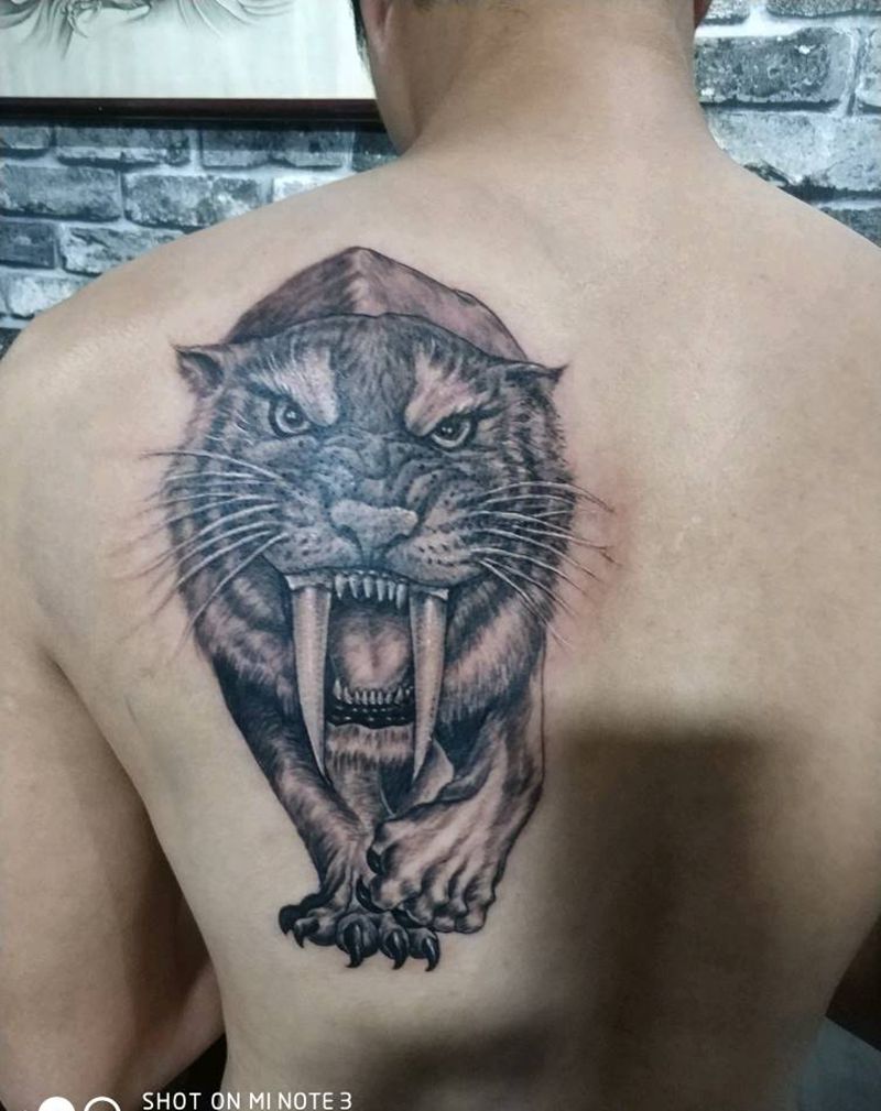 当前位置: 首页 >福建省莆田市纹身店-莆田纹艺刺青纹身图案>剑齿虎纹身图片_背部欧美写实纹身图案