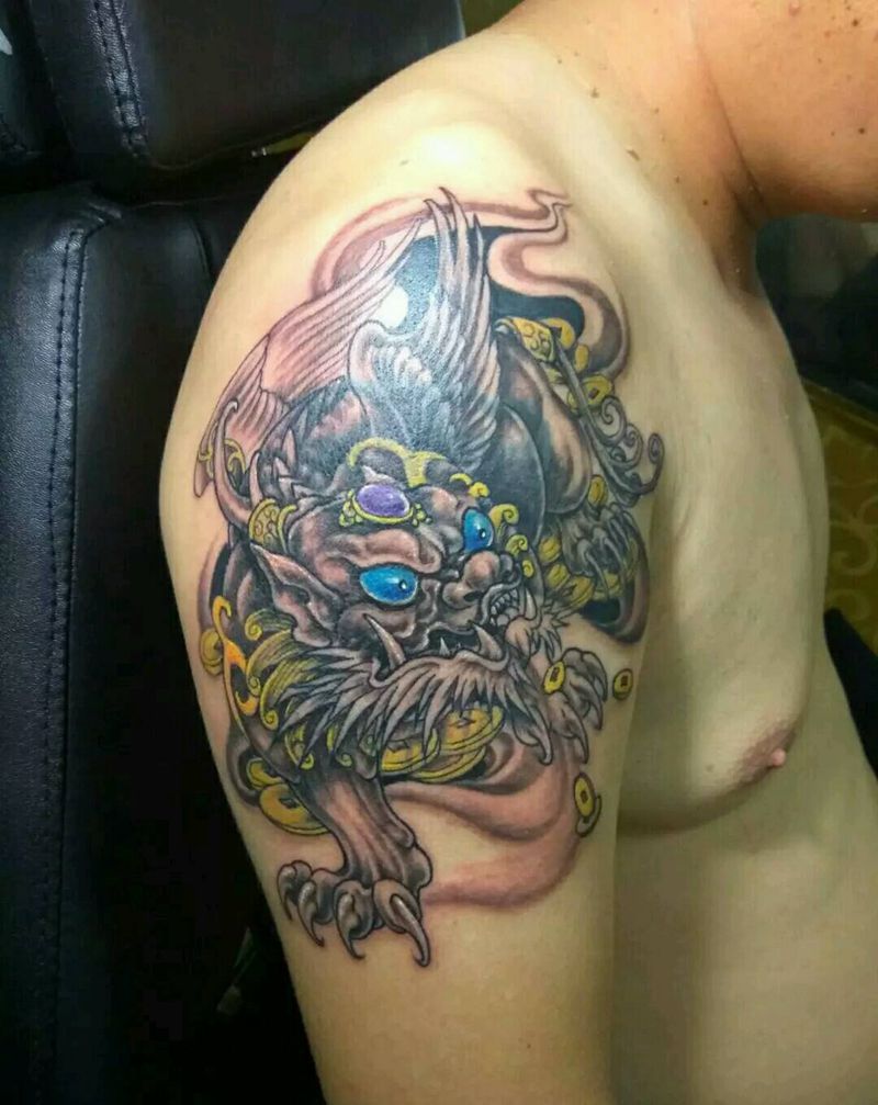 当前位置: 首页 >福建省莆田市纹身店-莆田纹艺刺青纹身图案>守财神兽貔貅纹身图片_手臂传统国画动物鬼神宗教纹身图案