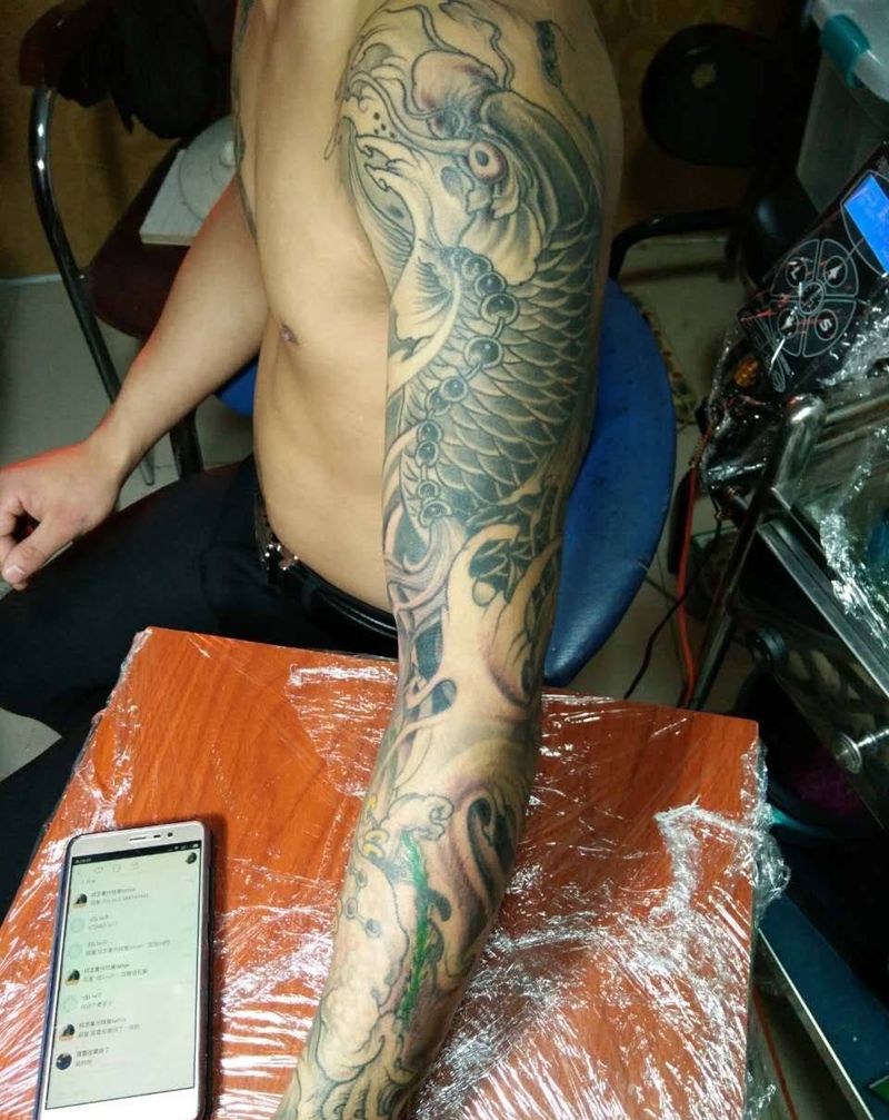 当前位置: 首页 >福建省莆田市纹身店-莆田纹艺刺青纹身图案>金蟾锦鲤花臂纹身图片_动物传统手臂成品纹身图案