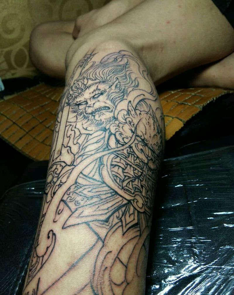 当前位置: 首页 >福建省莆田市纹身店-莆田纹艺刺青纹身图案>小腿暗黑悟空纹身图片_传统人物原创成品纹身图案