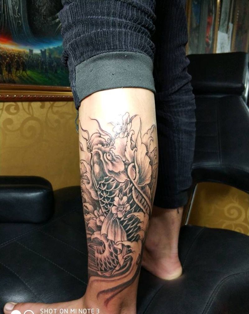 当前位置: 首页 >福建省莆田市纹身店-莆田纹艺刺青纹身图案>小腿锦鲤纹身图片_腿部传统动物成品纹身图案