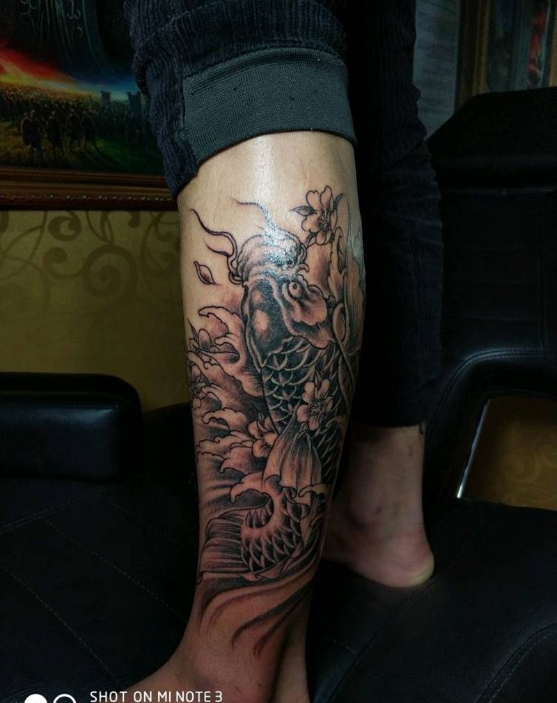 当前位置: 首页 >福建省莆田市纹身店-莆田纹艺刺青纹身图案>小腿锦鲤纹身图片_腿部传统动物成品纹身图案