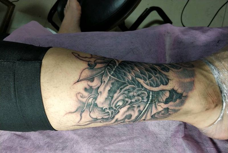 • T网红王老大花腿龙纹身图片_腿部新传统纹身图案