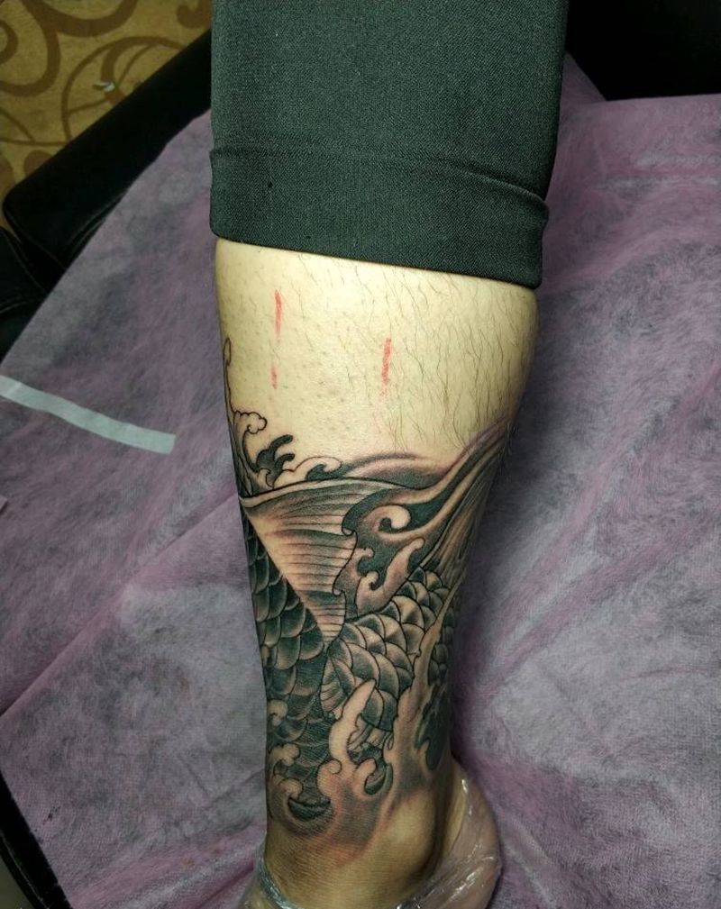 • T网红王老大花腿龙纹身图片_腿部新传统纹身图案