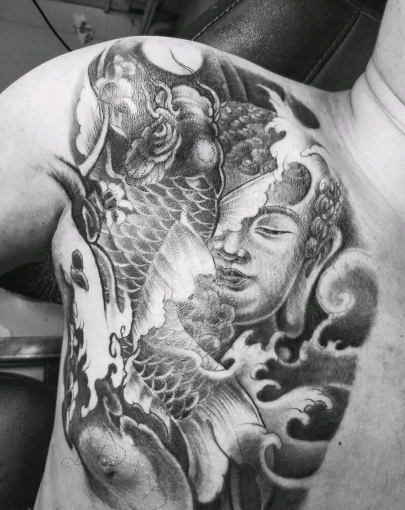胸口佛鱼作品纹身图片_手臂传统动物人物鬼神成品纹身图案