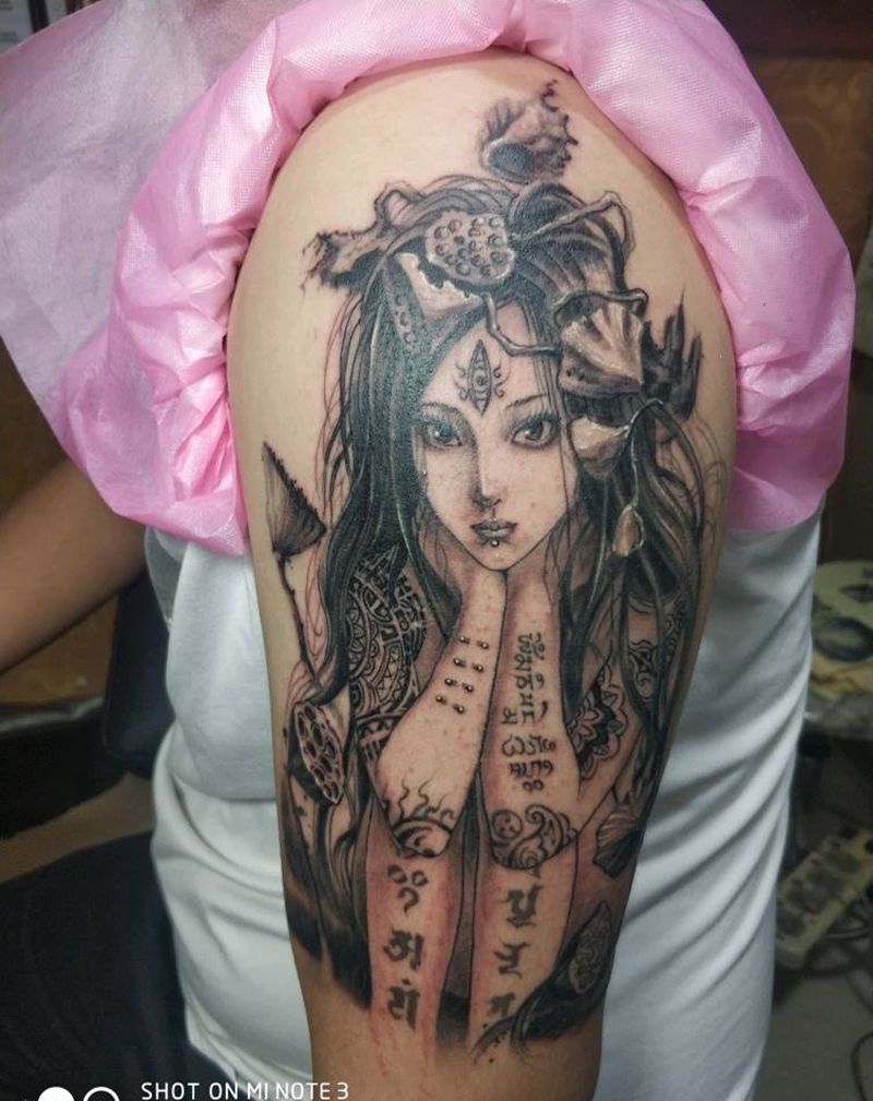 莲与佛,经文刺青的女孩纹身图片_手臂新传统纹身图案