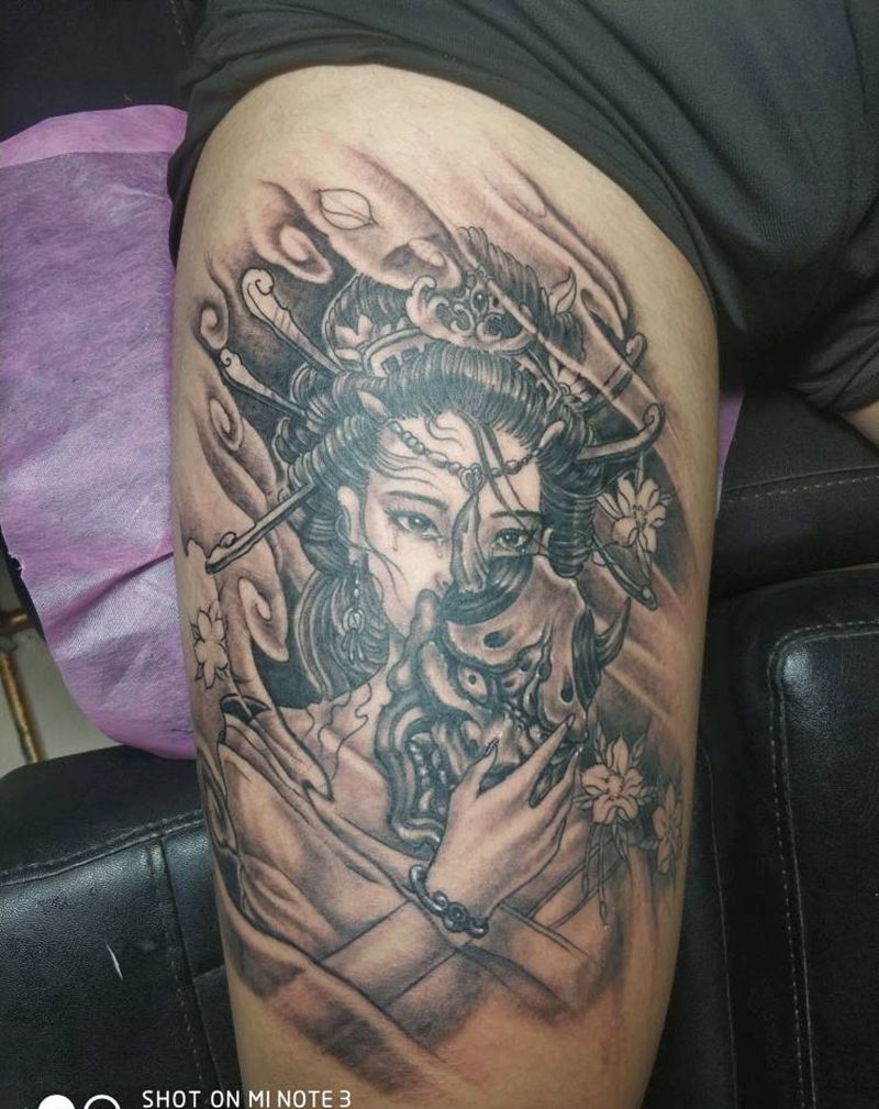 般若面具艺妓纹身图片_腿部新传统纹身图案