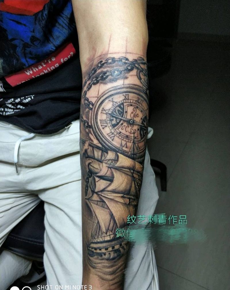 钟表帆船作品纹身图片_手臂欧美写实纹身图案