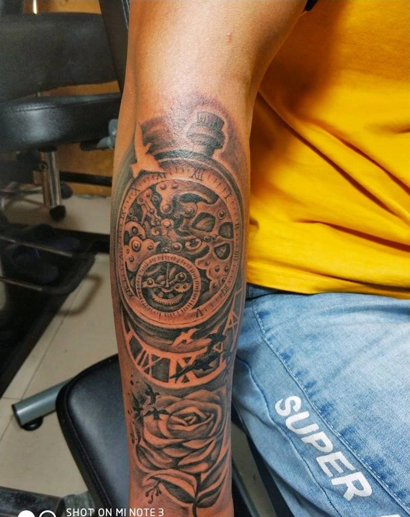 机械表和花纹身图片_手臂欧美写实纹身图案