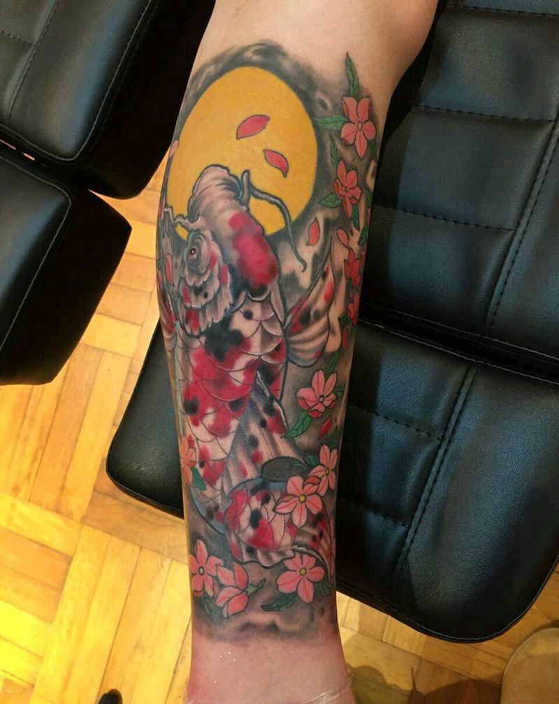 当前位置: 首页 >福建省泉州市纹身店-诚毅刺青纹身图案>原创富贵锦鲤纹身图片_手臂腿部传统习俗清新写实动物植物原创成品纹身图案