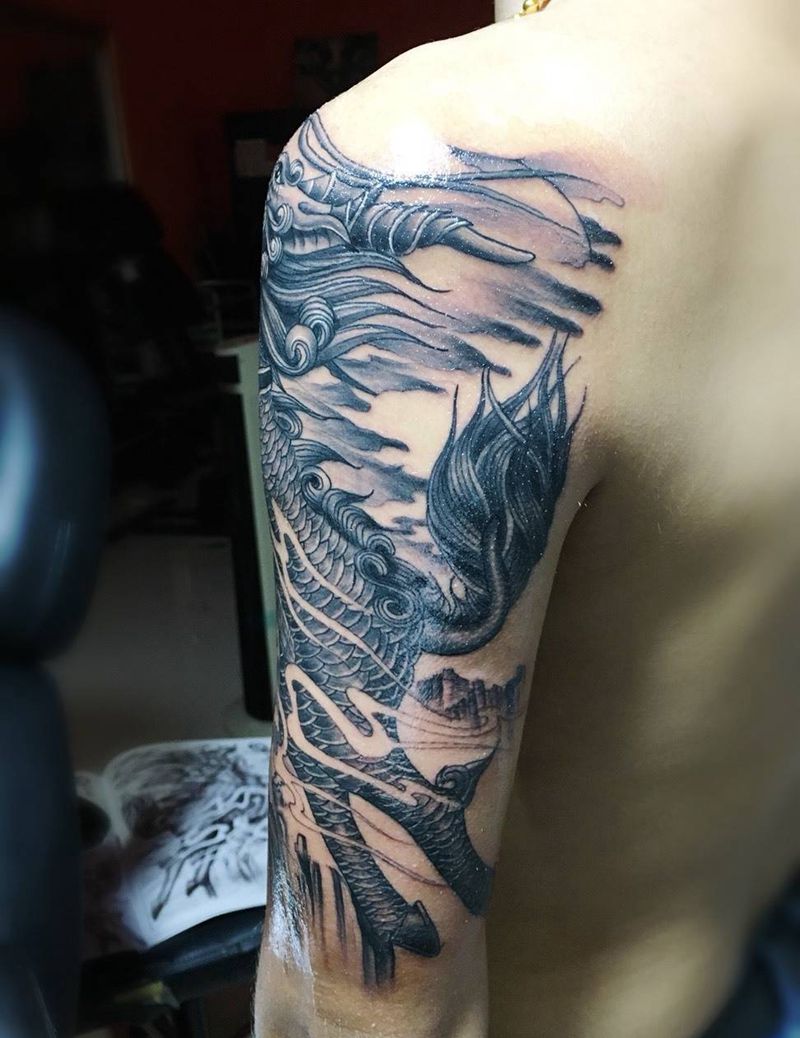 • T网红王老大花腿龙纹身图片_腿部新传统纹身图案