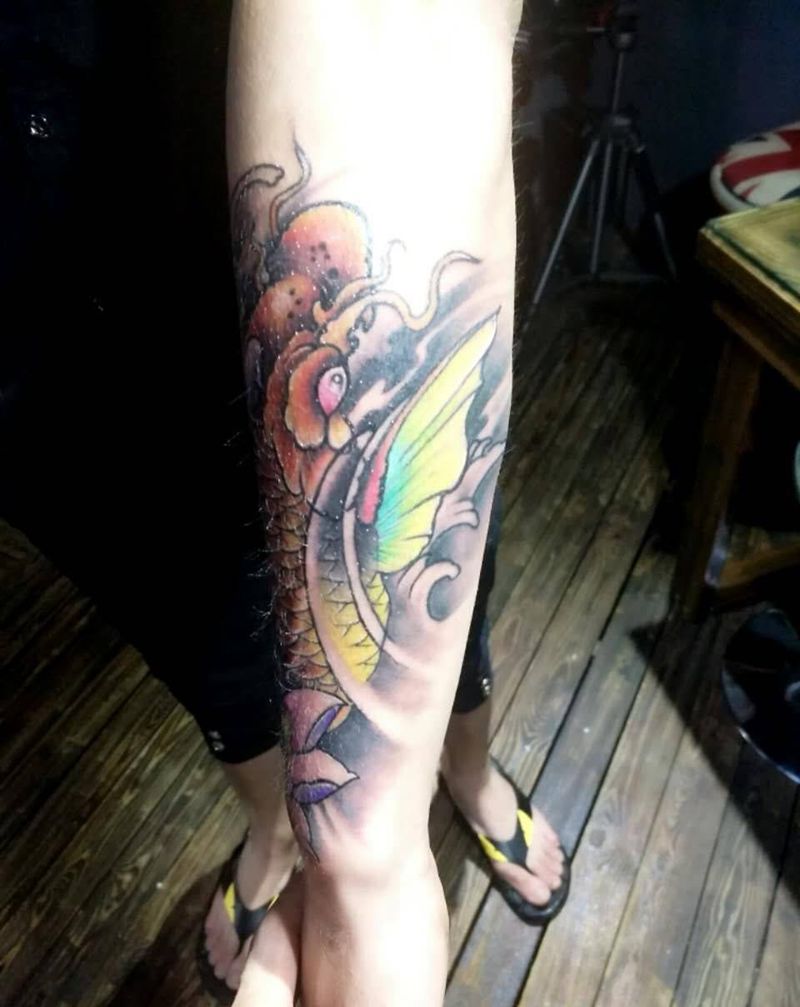 当前位置: 首页 >福建省泉州市纹身店-泉州鹏海刺青纹身图案>小臂鲤鱼彩色纹身图片