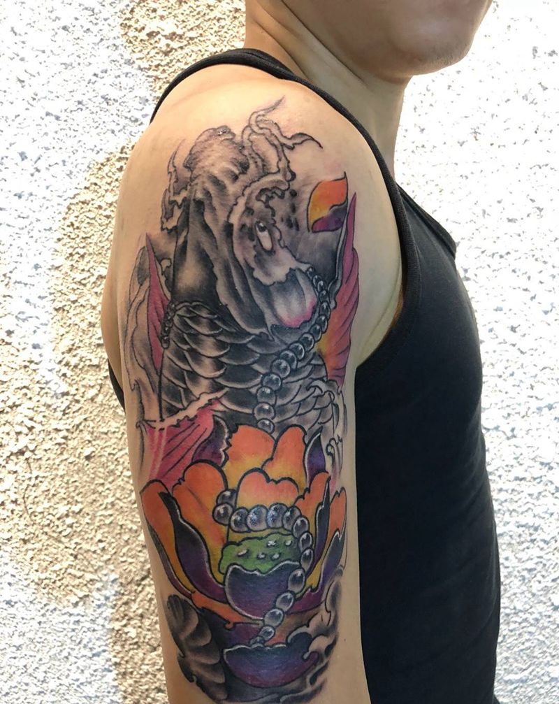当前位置: 首页 >福建省泉州市纹身店-纯针刺青纹身图案>鲤鱼转运纹身图片_国画传统成品手臂手部原创动物植物纹身图案