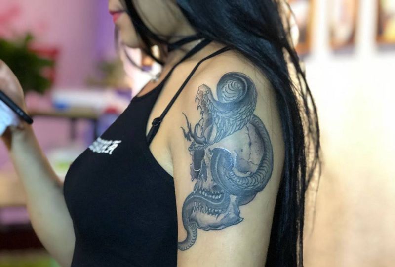 当前位置: 首页 >福建省泉州市纹身店-纯针刺青纹身图案>骷髅蛇纹身图片_手臂欧美写实纹身图案