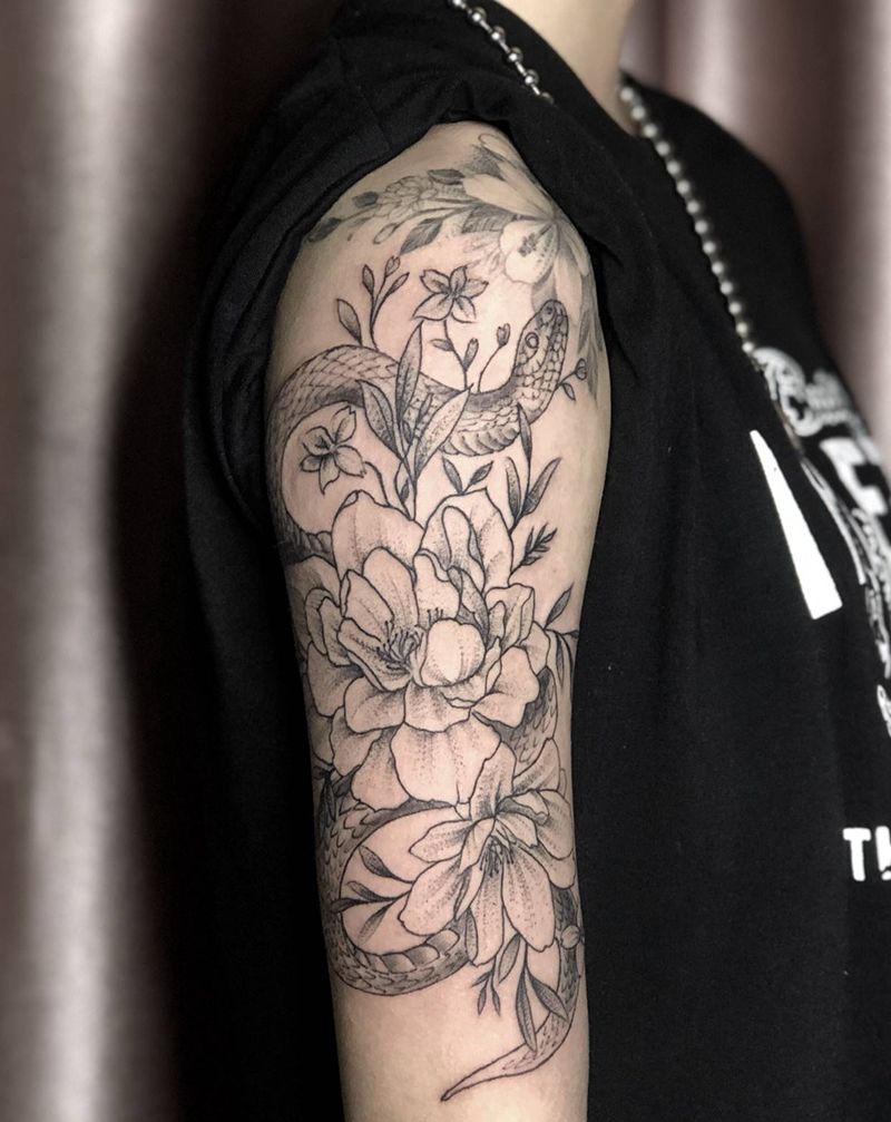 当前位置: 首页 >福建省泉州市纹身店-纯针刺青纹身图案>花与蛇纹身图片_手臂腿部点刺纹身图案