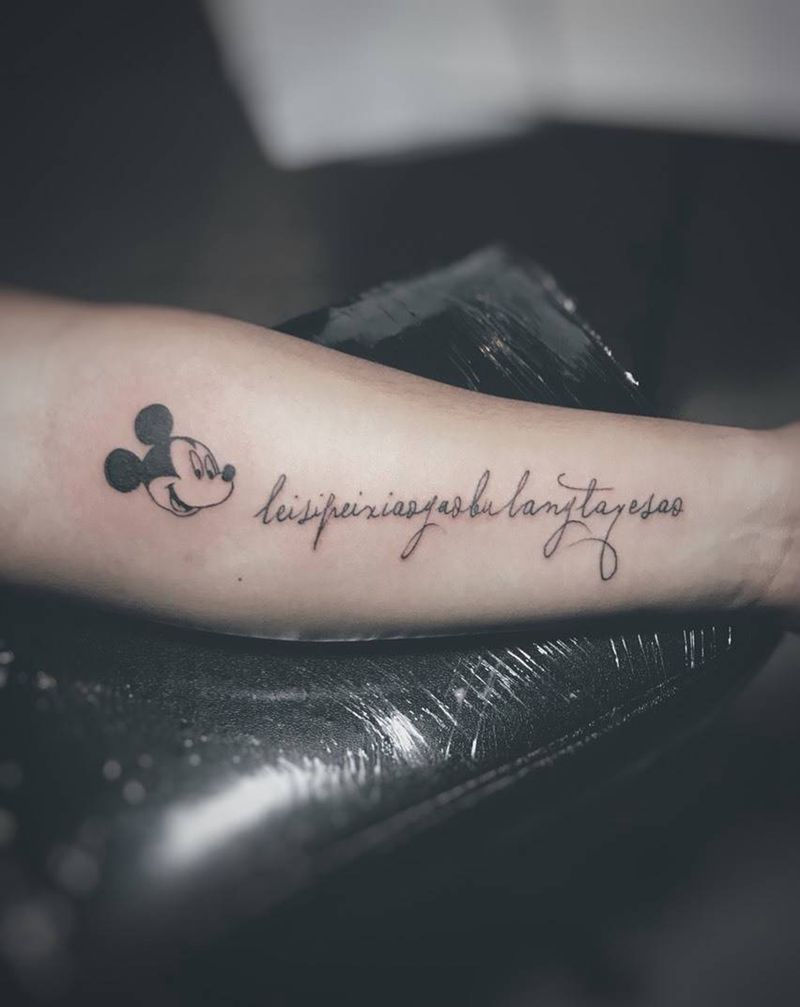 当前位置: 首页 >福建省南平市纹身店-萬物墨刻刺青处纹身图案>米奇和字母纹身图片_成品手臂清新字符人物纹身图案