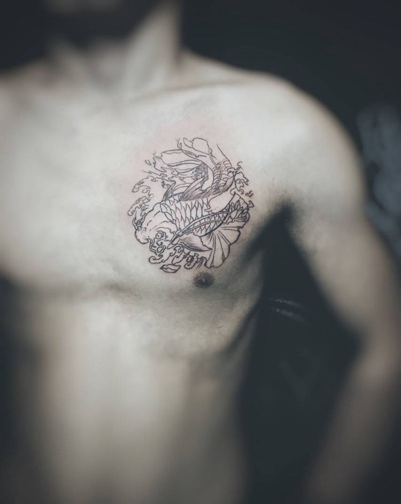 胸口锦鲤纹身图片_成品胸部传统动物纹身图案