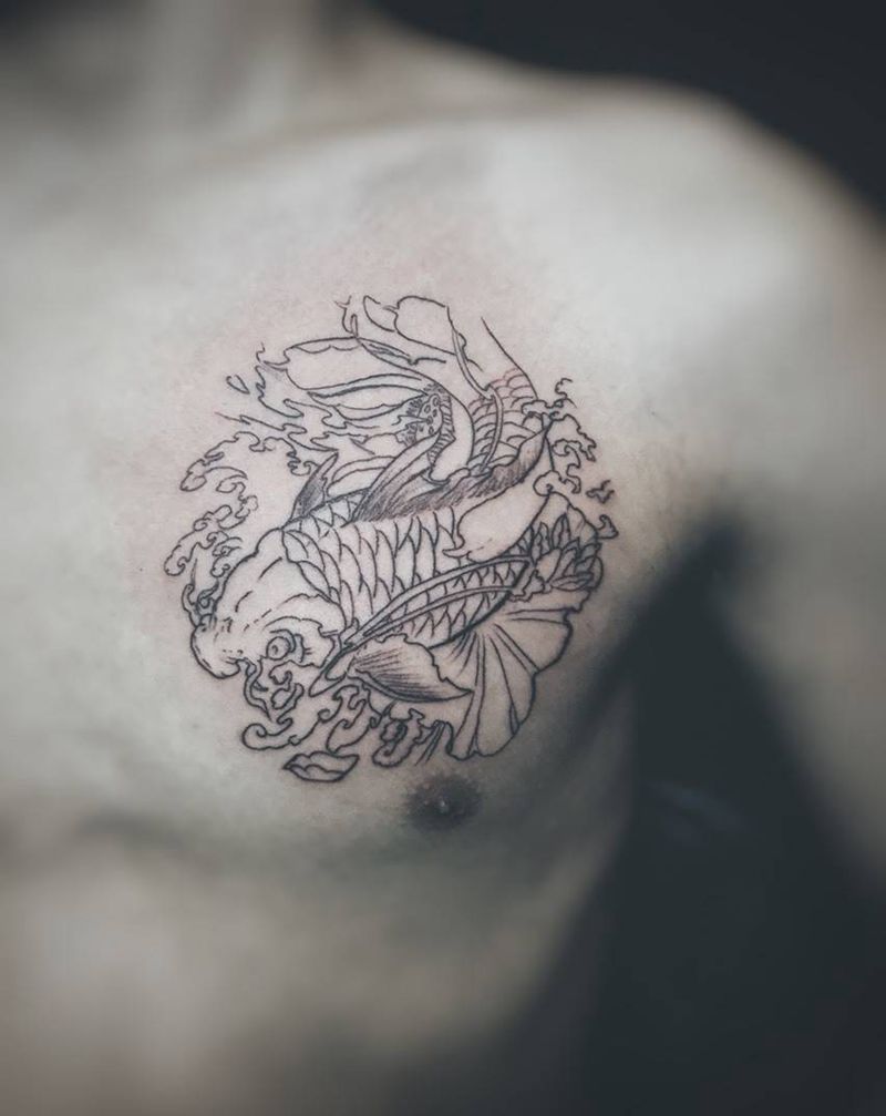 胸口锦鲤纹身图片_成品胸部传统动物纹身图案