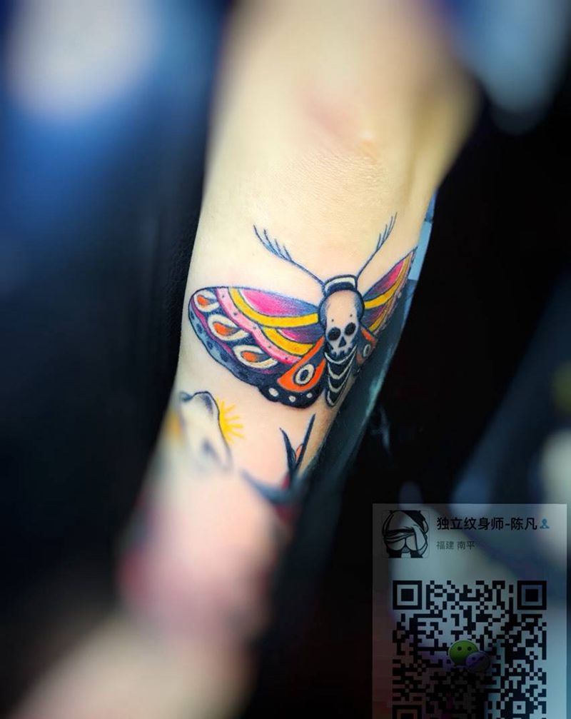 当前位置: 首页 >福建省南平市纹身店-萬物墨刻刺青处纹身图案>Old School大蛾子纹身图片_成品手臂欧美传统贴纸动物原创静物纹身图案