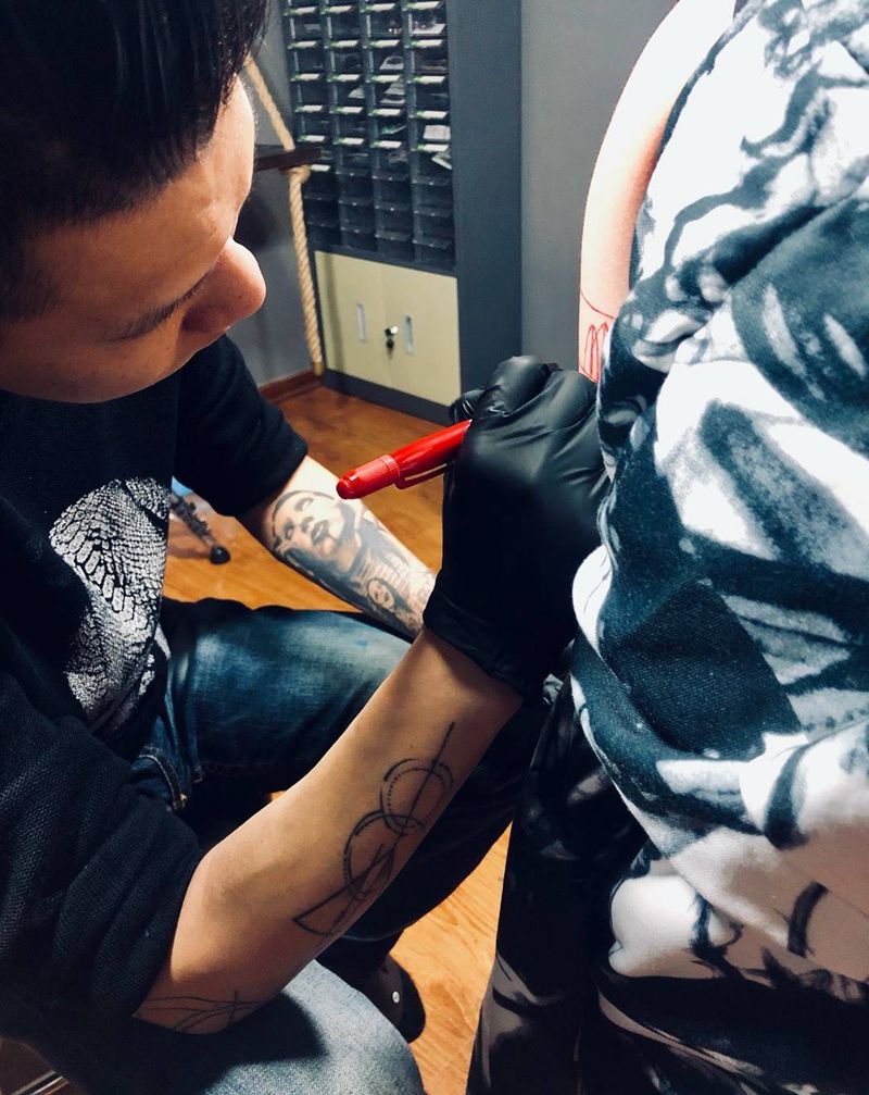 当前位置: 首页 >福建省南平市纹身店-萬物墨刻刺青处纹身图案>手绘遮盖纹身图片_手臂肩部几何点刺纹身图案