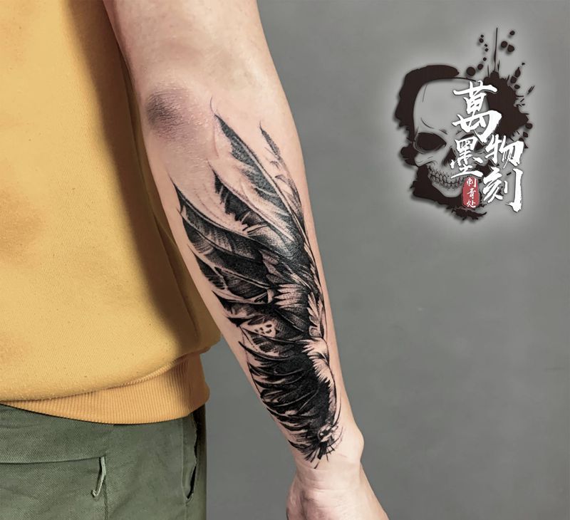 当前位置: 首页 >福建省南平市纹身店-萬物墨刻刺青处纹身图案>翅膀纹身图片_手臂手部欧美写实点刺纹身图案