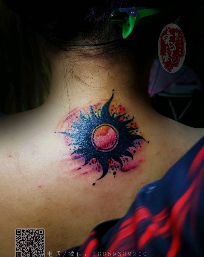 当前位置: 首页 >福建省宁德市纹身店-宁德市蕉城区蕉南东方龙刺青店纹身图案>太阳水彩纹身图片_颈部清新宁德福建东方龙纹成品纹身图案