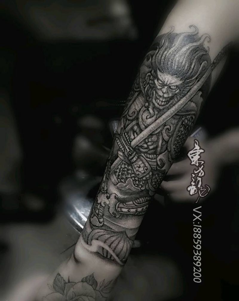 当前位置: 首页 >福建省宁德市纹身店-宁德市蕉城区蕉南东方龙刺青店纹身图案>猴哥包臂纹身图片_手臂新传统大圣悟空猴子纹身图案